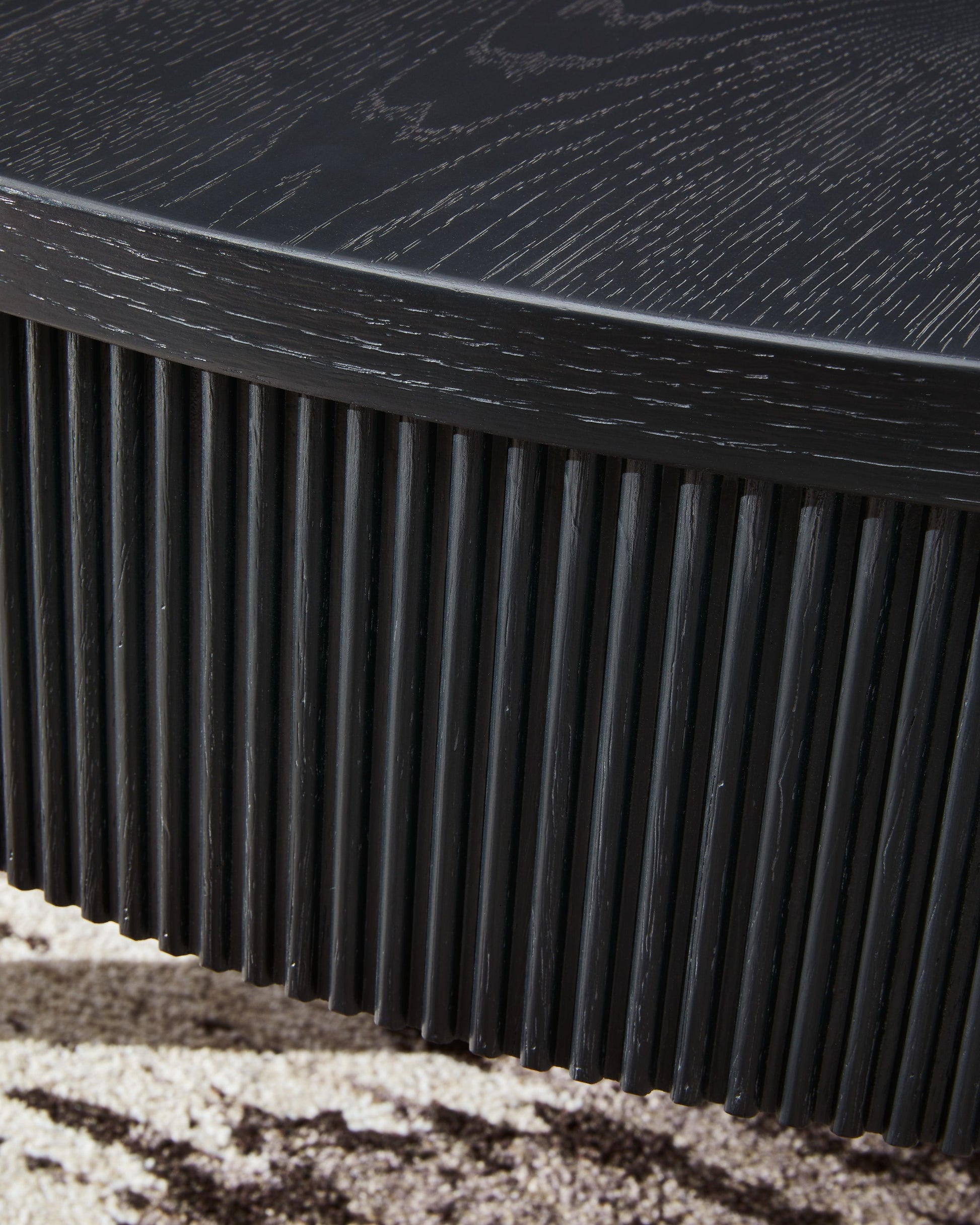 Classic and cool in dark charcoal, this coffee table brings contemporary convenience to your living room. Short on storage? The trendy reeded apron conceals a drawer perfect for remotes, controllers and other entertainment accessories. What a perfect marriage of style and functionality.