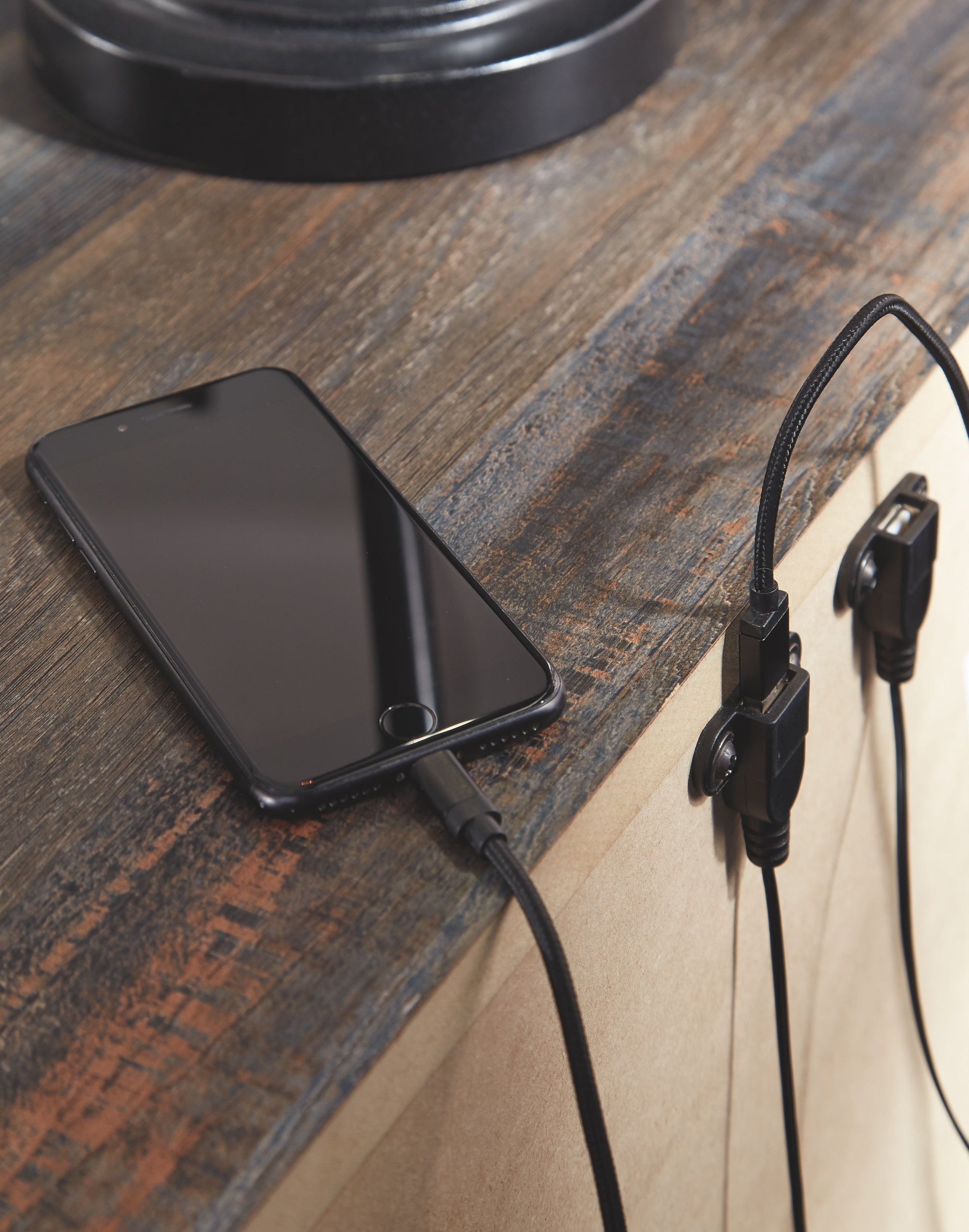 Burnt orange and teal colors accent a brown rustic finish in a replicated woodgrain with authentic touch. Large scaled dark colored handles. Cases feature a framed front and pilasters. All panel headboards (53,57,58,87) feature decorative matte black sconce lights. Side roller glides for smooth operating drawers. All panel headboards (53,57,58,87) can attach to a bolt-on metal bed frame B100-31 or B100-66 respectively. Drawers lined with a faux linen laminate for a clean, finished look. Slim profile dual USB chargers located on the back of the night stand top and the side of the headboards. All side storage options (50,150,60,160) requires the use of the B100-11, B100-12, B100-13 or the B100-14 roll slats. All under bed storage units (50,150,60,160) accommodates to 10.5"W x 10.5"D x 11"H cube storage bins. LED lights accent bookcase headboards (63,65,69,85). All beds have a panel footboard (52,84,54,56) and storage footboard option (52S,84S,54S, 56S). Queen (65) and king (69) headboards can attach to a bolt-on metal bed frame B100-31 or B100-66 respectively. Queen (65) bookcase headboard is capable of attaching a full sized metal bolt on bed frame. Twin (63) and full (85) headboards can attach to a bolt-on metal bed frame B100-21. Safety is a top priority, clothing storage units are designed to meet the most current standard for stability, ASTM F 2057 (ASTM International). Drawers extend out to accommodate maximum access to drawer interior while maintaining safety.