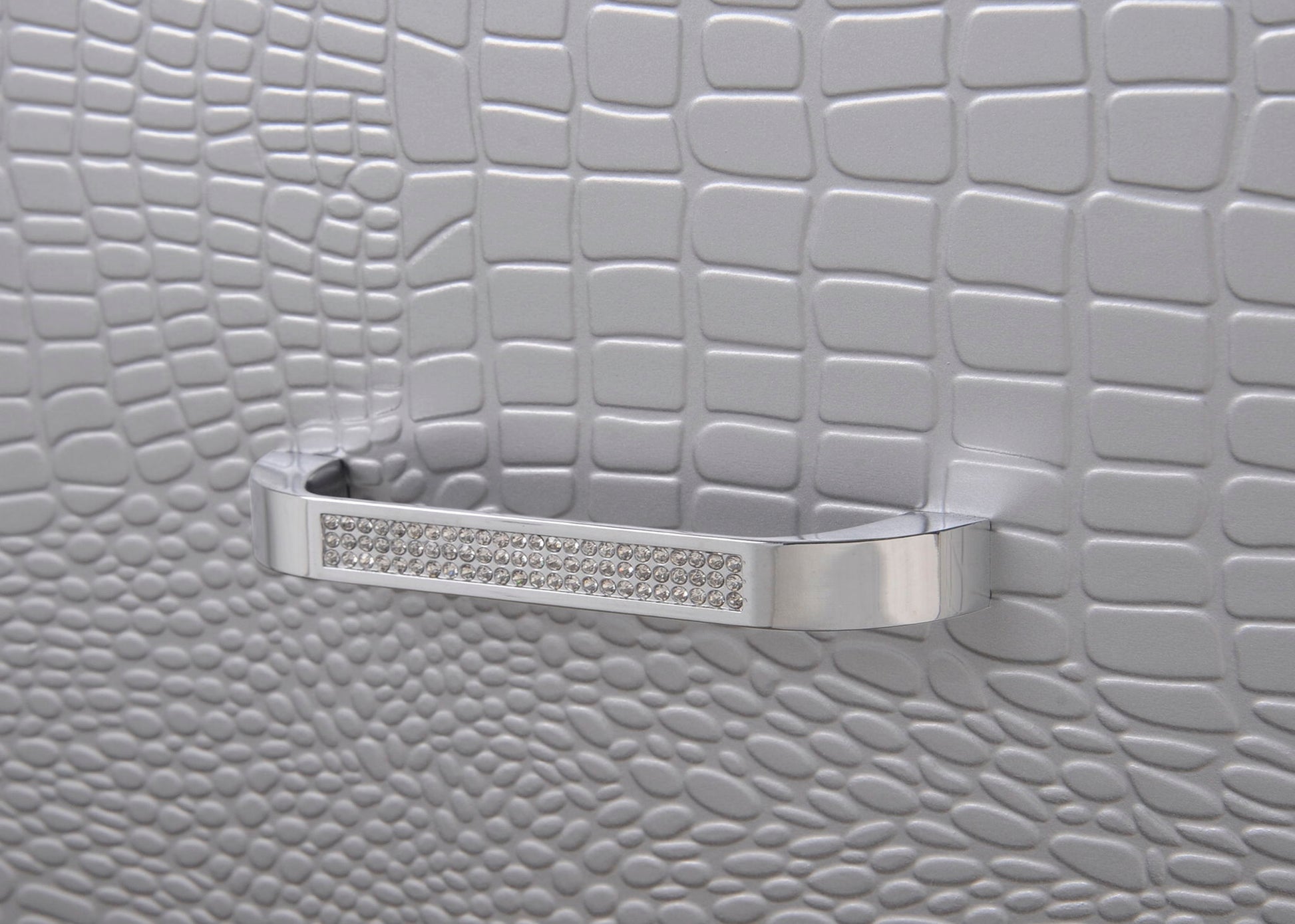 This bedroom collection offers a touch of glamour and luxury to any home. The chic finish paired with elegant textured panels creates a sophisticated look that can elevate any bedroom decor. The bed is a statement piece, featuring a stunning tufted headboard with integrated LED lighting that adds a classic touch to the modern design. Accompanying the bed is a selection of matching furniture pieces, including a dresser with a mirror, a tall chest, and nightstands, all finished in the same lustrous silver tone.