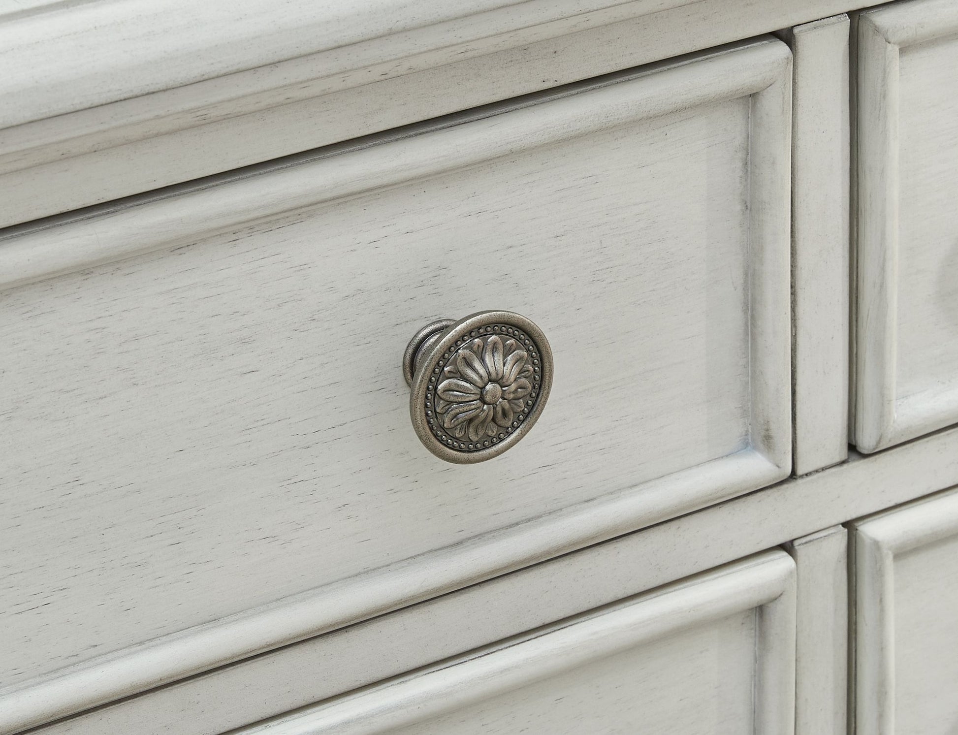 - Antiqued white finish