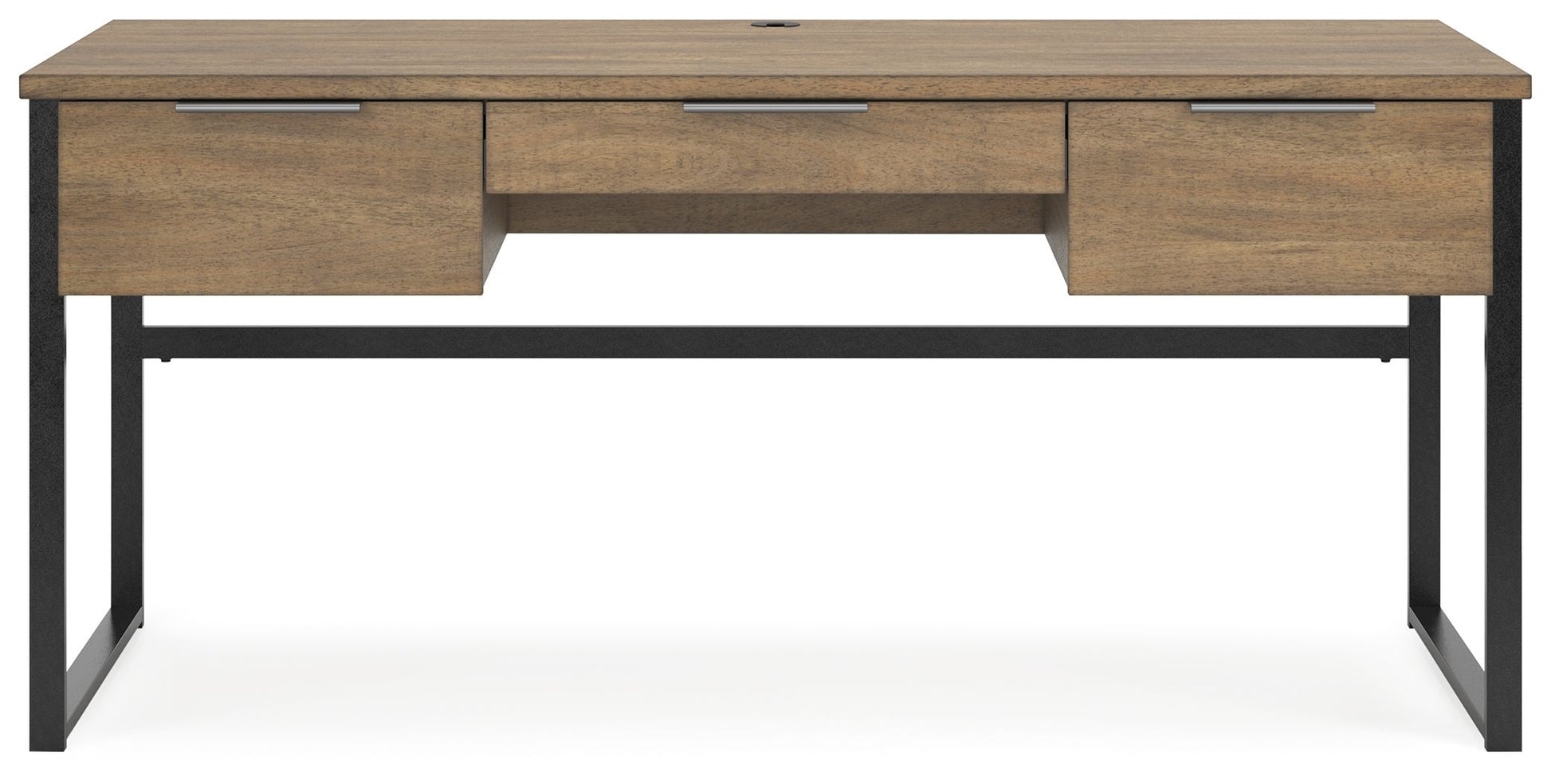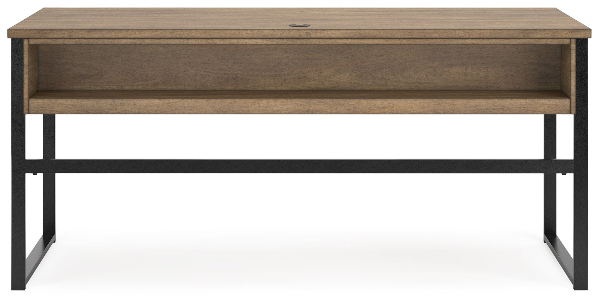 Urban Contemporary design. Made with Mango wood veneer, MDF substrate and metal frames. Finished in a light brown wood tone with contrasting gunmetal gray frames. Desk features 3 drawers and open raceway on the back side to help keep wires and power supplies neatly tucked out of sight. Matching bookcase with five 58" wide gallery shelves.